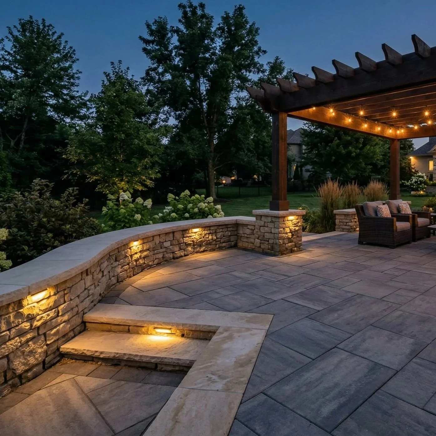 String lights on a pergola get a lot of attention on social media but the lighting that really makes a difference is the stuff built into the hardscape itself. Step lights, wall cap lights, up lighting on landscape features. That is what makes a space feel designed rather than decorated.