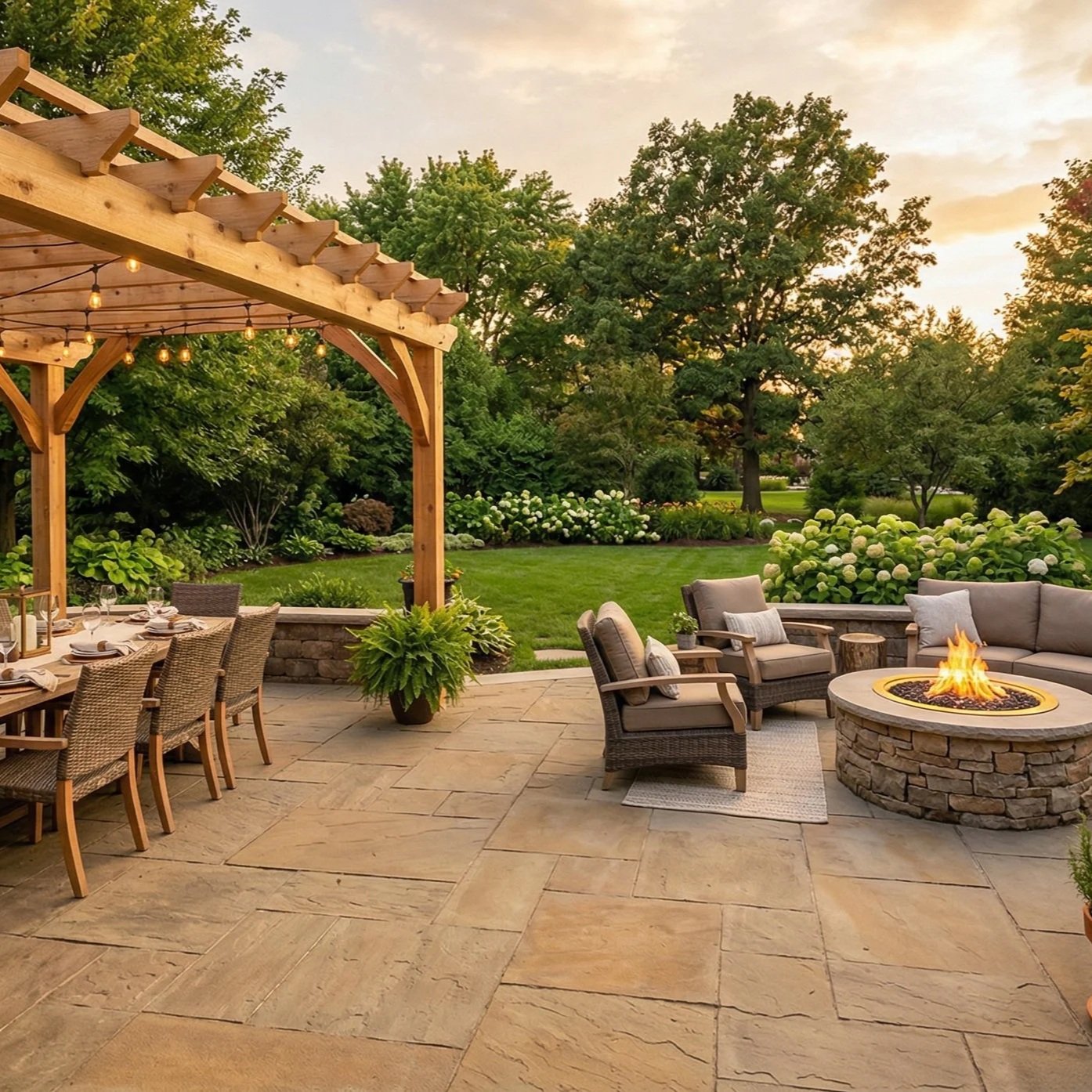 Kansas City has real winters, but that is not stopping homeowners from wanting to use their outdoor spaces as long as possible. Covered pavilions with ceiling fans and fireplaces, pergolas with string lights, built in fire features. People want to be outside in October just as much as July, and they are designing for it.
